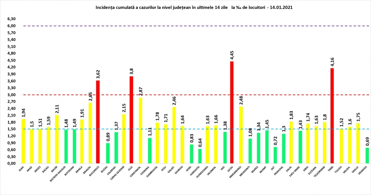 Până astăzi, 17.035 de persoane diagnosticate cu infecție cu SARS – CoV – 2 au decedat. În intervalul 13.01.2021, ora 10.00 – 14.01.2021, ora 10.00 au fost raportate 66 de decese (44 bărbați și 22 femei), ale unor pacienți infectați cu noul coronavirus, internați în spitalele din Alba, Arad, Argeș, Bacău, Bihor, Botoșani, Brăila, Brașov, Buzău, Constanța, Dâmbovița, Dolj, Galați, Gorj, Hunedoara, Ialomița, Iași, Maramureș, Olt, Prahova, Satu Mare, Sibiu, Suceava, Timiș, Tulcea, Vaslui, Vrancea, Ilfov și București.