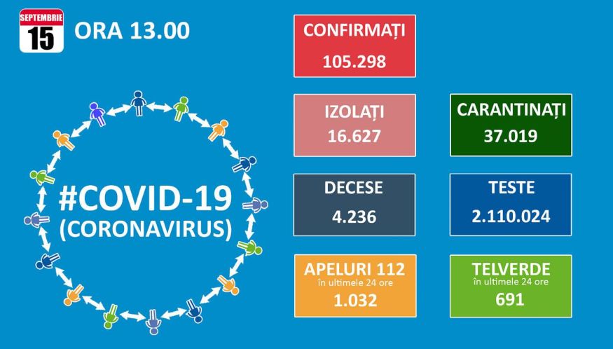 Până astăzi, 15 septembrie, pe teritoriul României au fost confirmate 105.298 de cazuri de persoane infectate cu noul coronavirus. În urma testelor efectuate la nivel național, față de ultima raportare, au fost înregistrate 1.111 cazuri noi de persoane infectate cu SARS-CoV-2, acestea fiind cazuri care nu au mai avut anterior un test pozitiv.