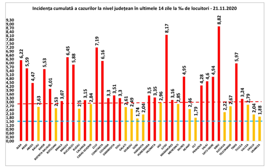 Până astăzi, 21 noiembrie, pe teritoriul României, au fost confirmate 412.808 cazuri de persoane infectate cu noul coronavirus. 287.310 de pacienți au fost declarați vindecați.