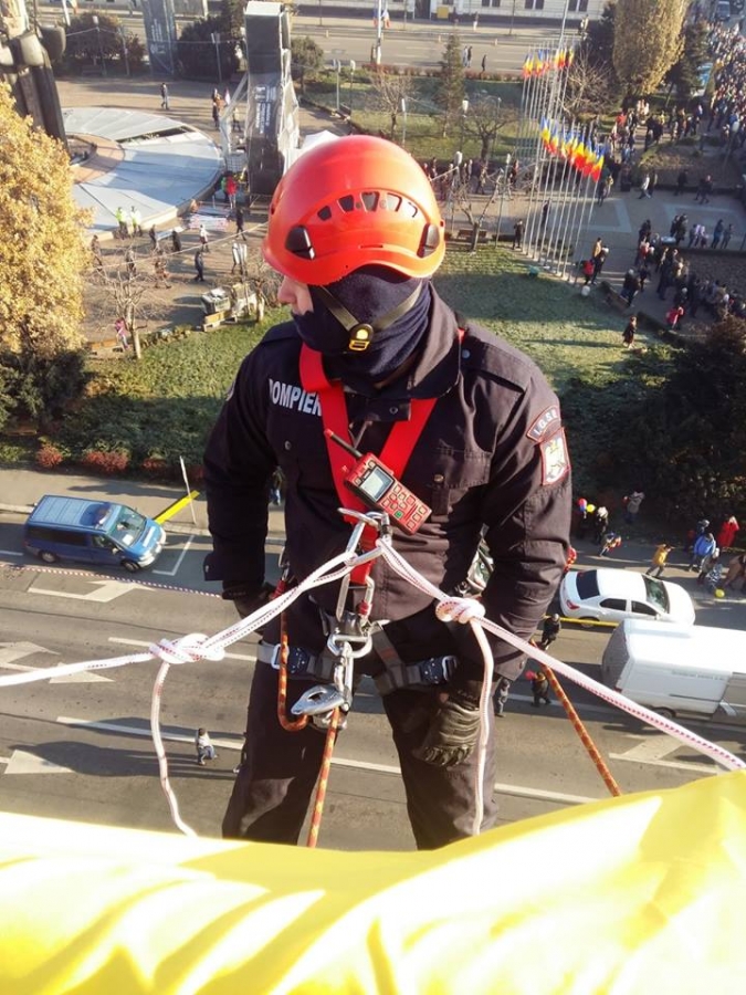 Pompierii clujeni au desfășurat un drapel întins pe clădirea Cercului Militar din Cluj-Napoca în timp ce se intona imnului național al României.