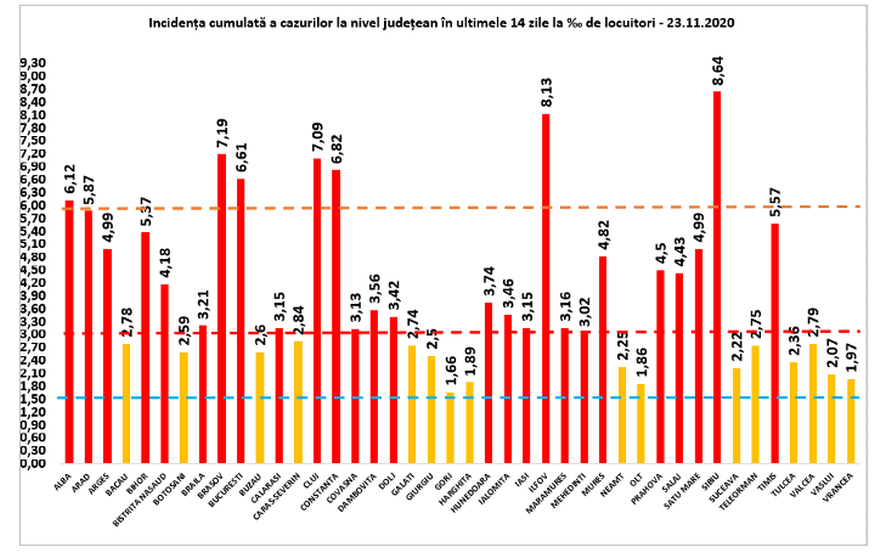 Până astăzi, 23 noiembrie, pe teritoriul României, au fost confirmate 422.852 de cazuri de persoane infectate cu noul coronavirus. 296.844 de pacienți au fost declarați vindecați.