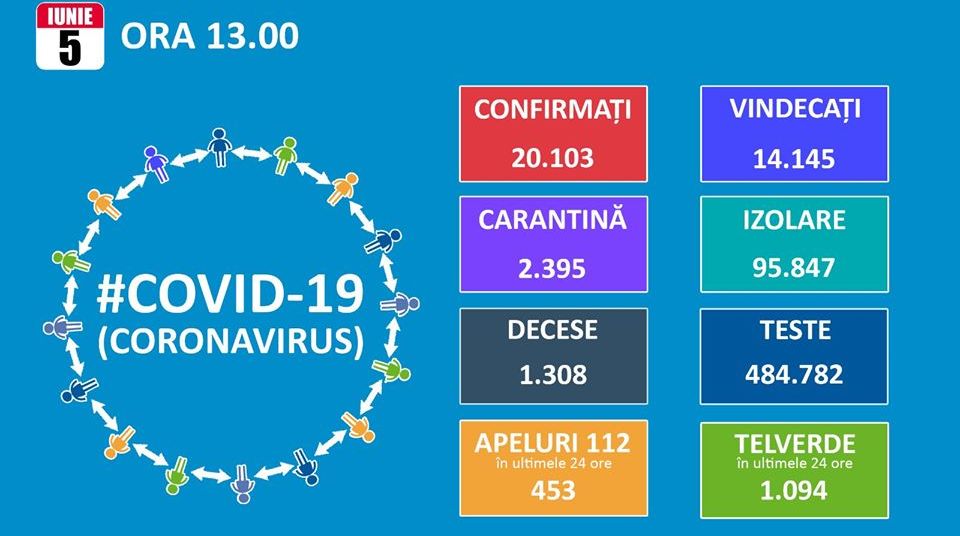 Până astăzi, 5 iunie, pe teritoriul României au fost confirmate 20.103 cazuri de persoane infectate cu noul coronavirus. Dintre persoanele confirmate pozitiv, 14.145 au fost declarate vindecate și externate.