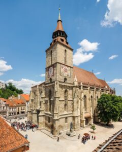 *** Cel mai cunoscut edificiu din Brașov este Biserica Neagră a cărei construcţie a început în anul 1383, când Braşovul se afla într-o perioadă de puternică dezvoltare culturală şi economică. În momentul finalizării ei, în anul 1477, parohia braşoveană, la acea dată de rit catolic, a primit hramul Sfintei Maria. În prezent, Biserica Neagră aparţine cultului Evanghelic.