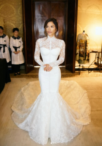Miliardarul american a purtat un smoking negru cu papion, în timp ce mireasa Lauren a purtat o rochie sirenă concepută de Dolce & Gabbana, ”cu gât înalt, finisată cu 180 de nasturi acoperiţi cu şifon de mătase şi un voal din tul şi dantelă, inspirat de cel purtat de Sophia Loren în filmul Houseboat din 1958”. La această rochie a asortat un voal alb clasic.
