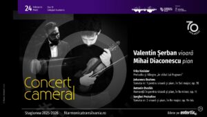 Lucrări camerale celebre vor fi prezentate marți, 24 februarie 2026, publicului meloman clujean în interpretarea a doi artişti deosebit de sensibili şi efervescenţi: Valentin Șerban – vioară şi Mihai Diaconescu – pian. În program: Fritz Kreisler – Preludiu și Allegro „în stilul lui Pugnani”; Johannes Brahms – Sonata nr. 1 pentru vioară și pian, în Sol major, op. 78; Antonín Dvořák – Romanță în pentru vioară și pian, în fa minor, op. 11; Serghei Prokofiev – Sonata nr. 2 vioară și pian, în Re major, op. 94bis.