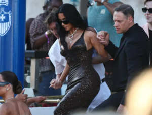 Ținuta fără bretele includea un corset metalic strâns pe talie, o bandă satinatã decorată cu flori brodate și o fustă mulată cu imprimeu asortat. Bijuteriile au completat apariția într-un registru la fel de opulent: cercei masivi din diamante, un inel suplimentar de efect și verigheta sa impresionantă.