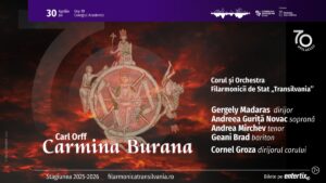 O dedicație specială pentru melomanii clujeni și pentru iubitorii muzicii lui Carl Orff, joi, 30 aprilie 2026, în ultima zi a lui prier, Carmina Burana revine pe scena sălii Auditorium Maximum (ora 19.00 / Colegiul Academic) sub bagheta dirijorală a lui Gergely Madaras. Alături de Orchestra și Corul Filarmonicii (dirijor Cornel Groza), vor urca pe scenă și soliștii Andreea Guriță Novac (soprană), Andrea Mirchev (tenor) și Geani Brad (bariton).