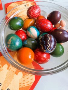 În familie, ouăle sunt vopsite după reţetele clasice, cu vopseluri din comerţ, însă la sate se mai păstrează încă tradiţia vopsirii ouălor prin metode naturale.