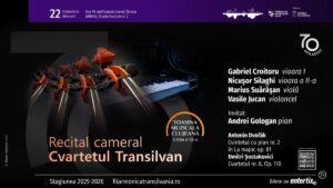 Miercuri, 22 octombrie 2025, ora 19.00, Amfiteatrul Cornel Țăranu al ANMGD, de pe strada Bucium nr. 2 își va deschide porțile pentru a găzdui un recital cameral al Cvartetului Transilvan (Gabriel Croitoru – vioara I, Nicuşor Silaghi – vioara a II-a, Marius Suărăşan – violă și Vasile Jucan – violoncel) alături de Andrei Gologan (pian). Din programul serii vor face parte Cvintetul cu pian nr. 2 în La major, op. 81 de Antonín Dvořák și Cvartetul nr. 8, Op. 110 de Dmitri Șostakovici.