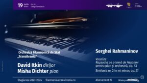 Iubitorii muzicii clasice sunt aşteptaţi vineri, 19 aprilie 2024, de la ora 19.00, la Colegiul Academic pentru a audia lucrări de Serghei Rahmaninov în interpretarea Orchestrei Filarmonicii de Stat „Transilvania”. La pupitrul dirijoral se va afla maestrul David Itkin, iar la pian Misha Dichter. În program: Vocalize, Rapsodia pe o temă de Paganini pentru pian și orchestră, op. 43, Simfonia nr. 2 în mi minor, op. 27.