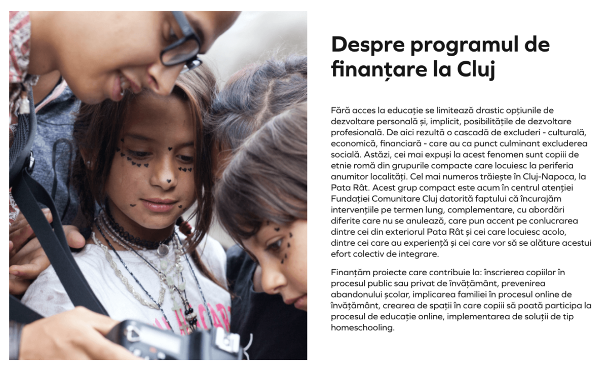 Fondul oferă sprijinim financiar în valoare de 1.187.500 de lei și mentorare celor mai bune soluții locale. În Cluj, acesta susține incluziunea socială prin educație pentru peste 400 de copiii și tineri din Pata Rât, iar valoarea fondului este de 237.500 de lei.