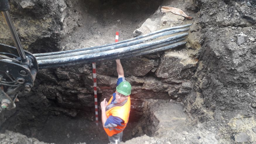 Specialiștii au găsit astăzi un nou fragment din zidul medieval al orașului, pe strada Tipografiei. Săpăturile au coborât până la aproximativ 3 metri adâncime, ele fiind îngreunate de numărul mare de rețele care traversează zona.