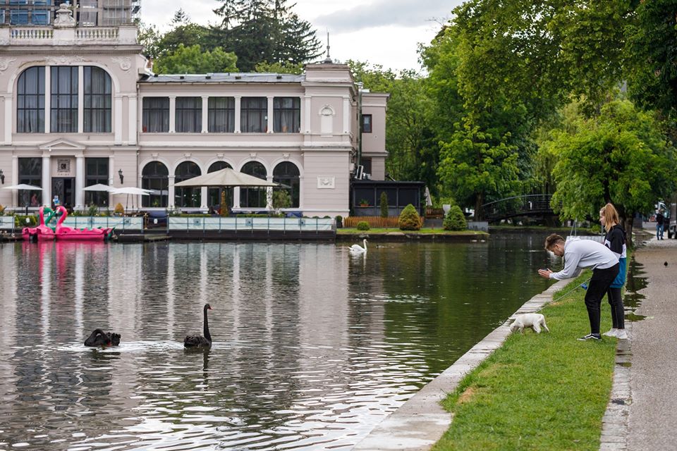 Grațioasele păsări care îi încântă pe clujeni și turiști în Parcul Central au revenit pe lac și și-au luat locul alături de rațe.
